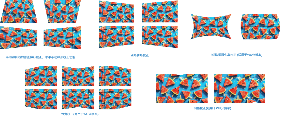 除了基础的手动和自动的垂直梯形校正以及水平梯形校正功能,另外还提供了四角校正、枕形/桶形失真校正,六角校正,多点网格校正,各种环境都可应对,满足各种使用需求,使投影机可以在不平整的投影面上取得优异的成像效果。