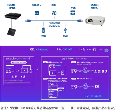 可选配定制HDBaseT接口,适用于更多使用场景。只需一根Cat5e/6网线,可实现最长100米高清信号实时传输,简化工程布线工作,适应复杂安装环境,提高稳定性。可选配的无线投屏功能可支持移动端与PC端投屏。
