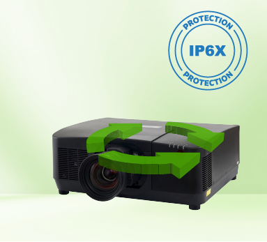 Gemini系列工程机光学引擎达成IP6X级高密度防尘,全密闭光机防尘设计,全面防尘阻隔,有效防止灰尘进入。无滤网设计,使用免维护,更安心。
