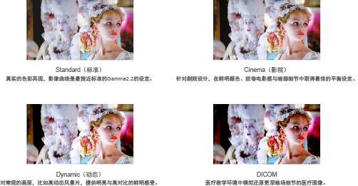 预设多种专业影像模式,根据不同应用场景一键直达,动态模式提供亮度和色彩最均衡的表现; 影院提供精准D65和符合HDTV色域的标准画质;DICOM模式可以在医疗教学环境中清晰地还原更深暗场细节的医疗图像。